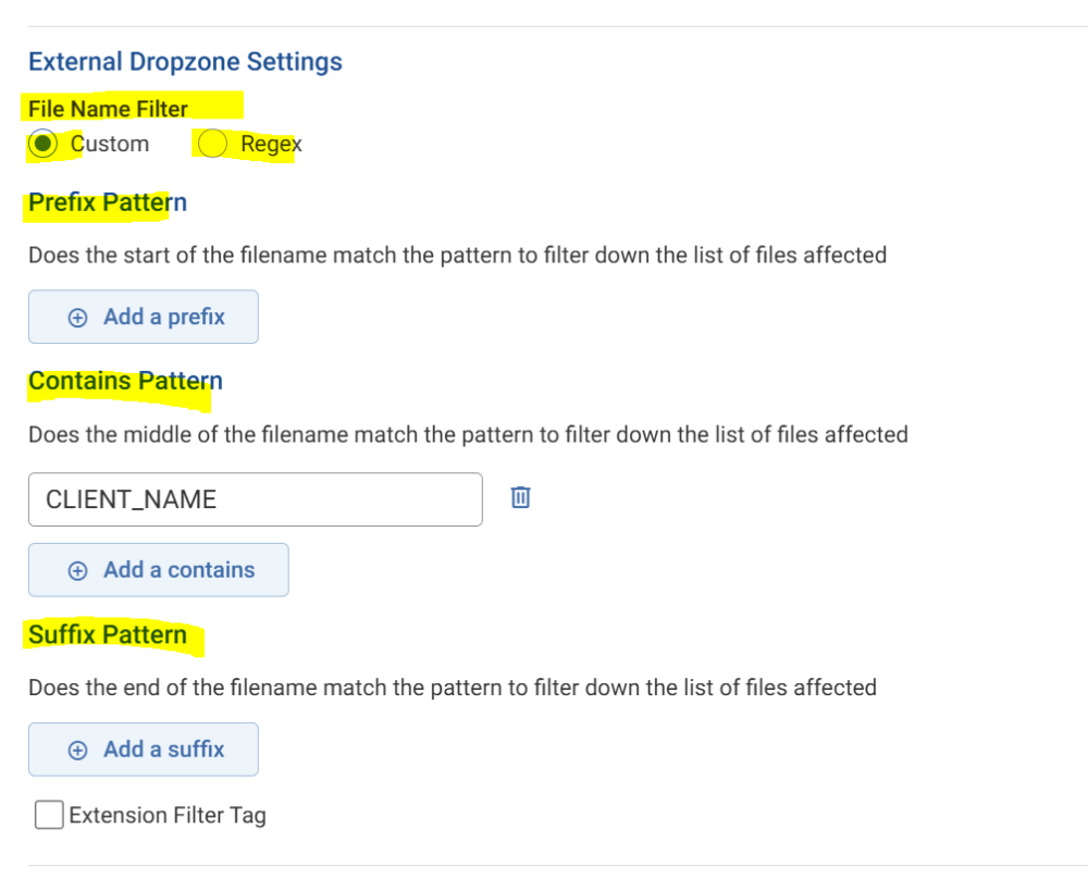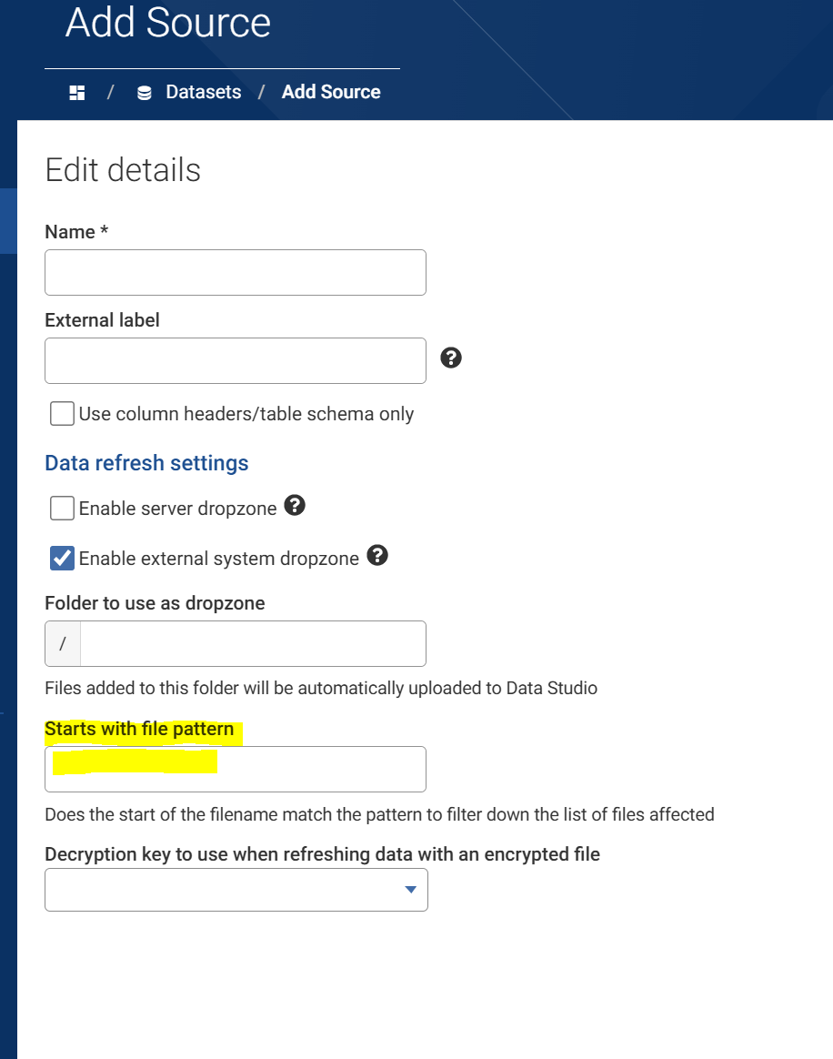 I really like the capability to have multiple dataset sources, I have used it numerous times - good upgrade. However, I notice that when adding a new source (such as External System), if I select 'Enable external system dropzone' the only name option I get is 'Starts with file pattern' whereas if this was the default source, the options for external dropzone naming are more detailed (starts with, contains, regex etc).