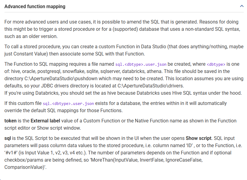 We're looking at implementing pushdown with Snowflake and have hit a couple of functions where we've had to workaround to avoid blocking the pushdown process. However, this advanced function mapping (as per documentation screenshot below) may help us fill some of those gaps and keep our workflows simpler. 3 questions: