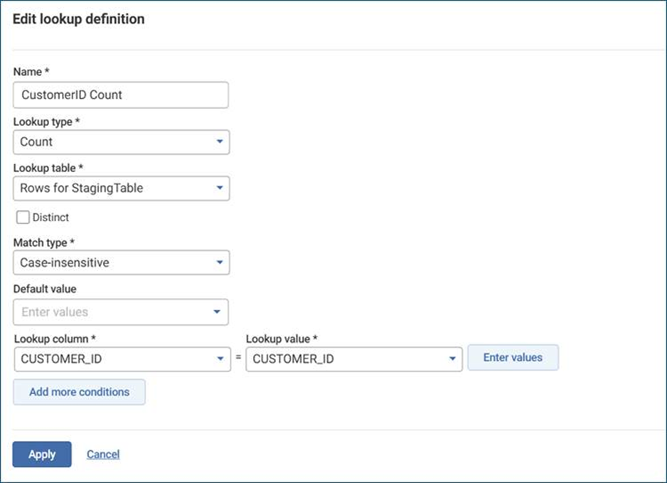 - Use lookup functions (E.g. Contains Match) to compare your field values (e.g.,