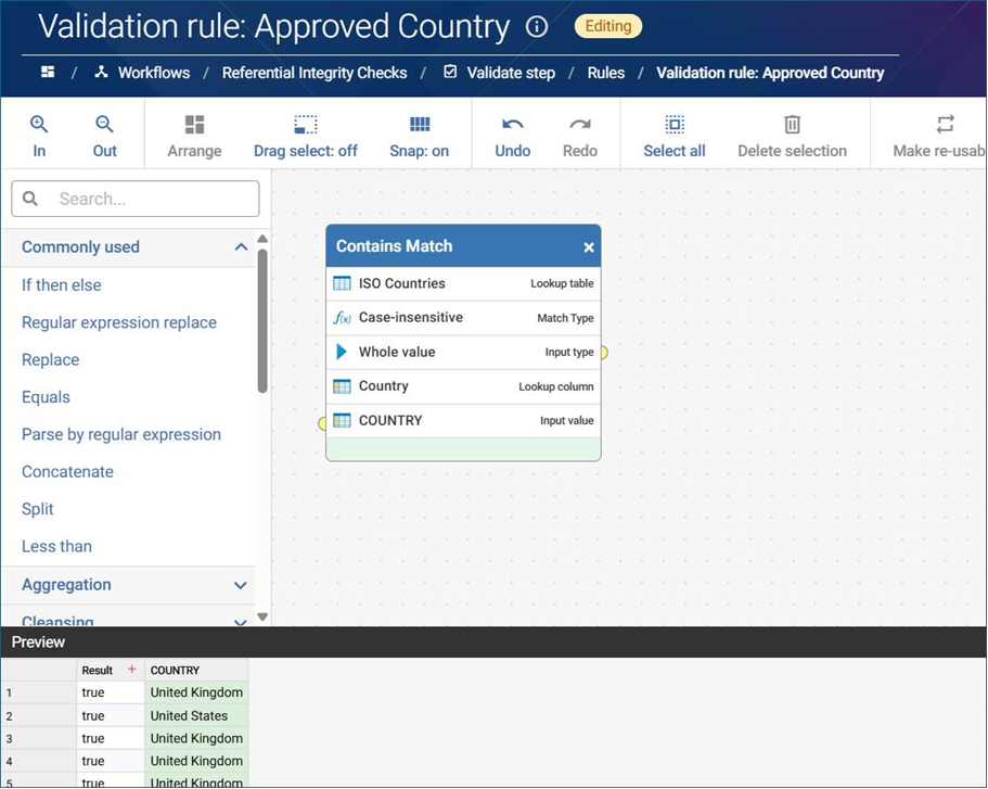 - Make sure your approved list (e.g., valid country codes) is available as a dataset in Data Studio. This allows you to reference it in lookup functions/surface it in your workflow.