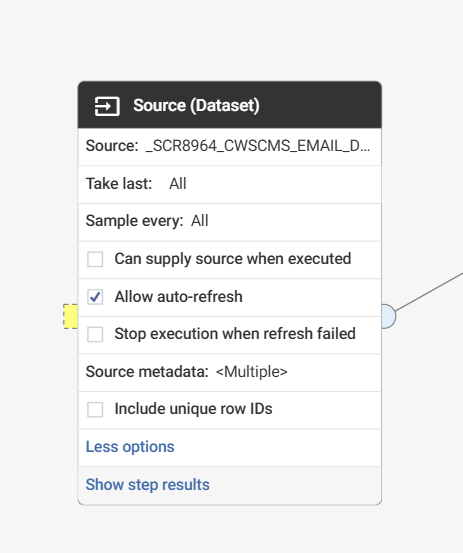 I have a multi-batch dataset (lets say DS1) that is configured for an external dropzone. When new data gets dropped and loaded into the dataset DS1 an automation then fires off a workflow. The workflow then gets that dataset DS1, and does some transformations, grabs metadata etc and then writes that dataset as a whole to a snapshot (lets say DS2).